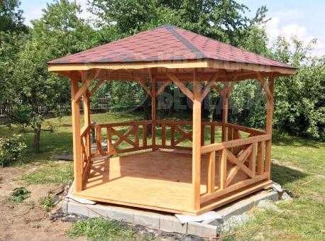 Деревянная беседка для дачи “Фазенда” - шестигранная беседка, похожа на "Летнюю", однако отличается от нее формой ограждений. Такую беседку возможно установить как на цементные блоки, так и на заранее подготовленную площадку.