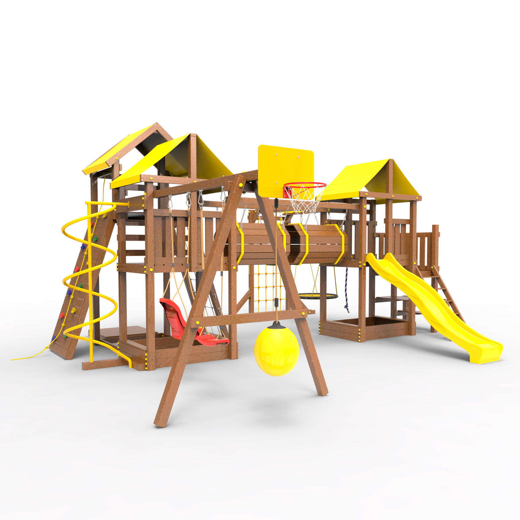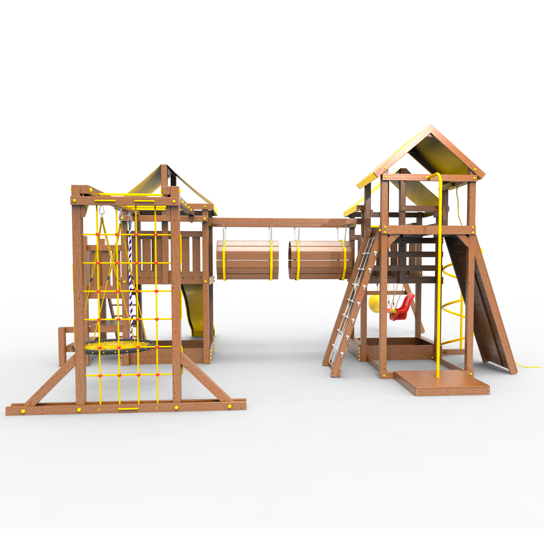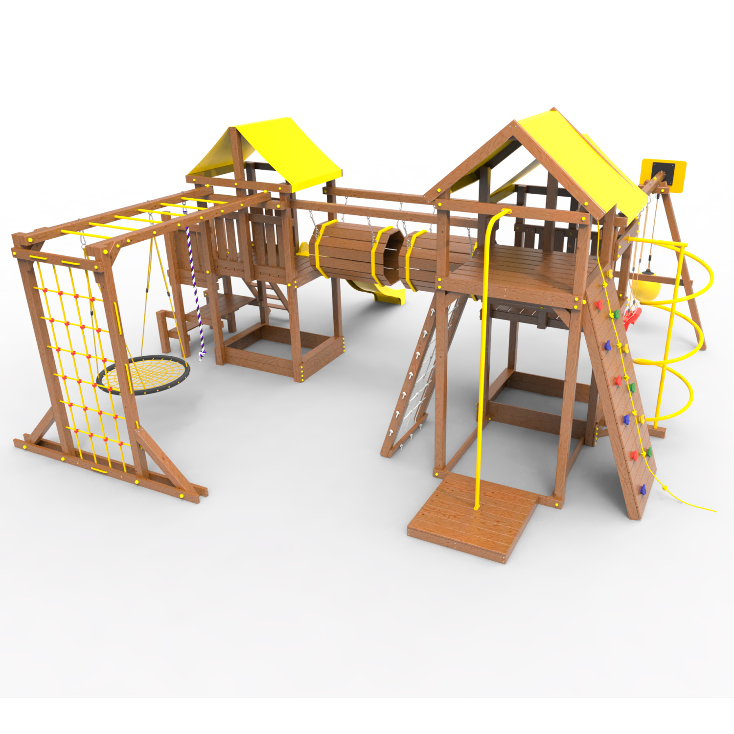 Два домика|Песочница|Лестница|Шторм-трап|Скалодром|Рукоход|Шведская стенка|Турник|Руфер|Баскетбольная корзина|Мостик|Горка|Спираль|Волна|Сеть для лазания|Качели |