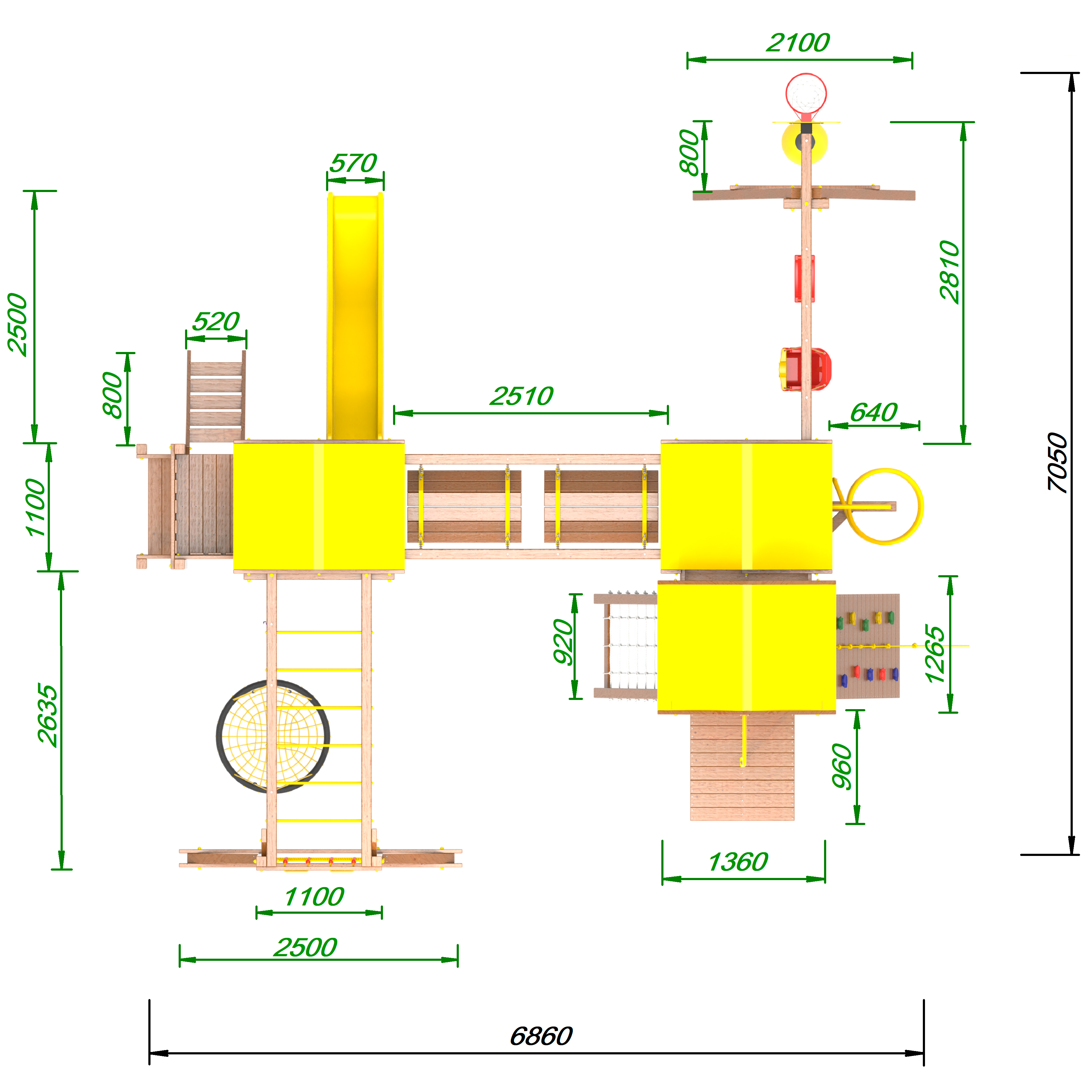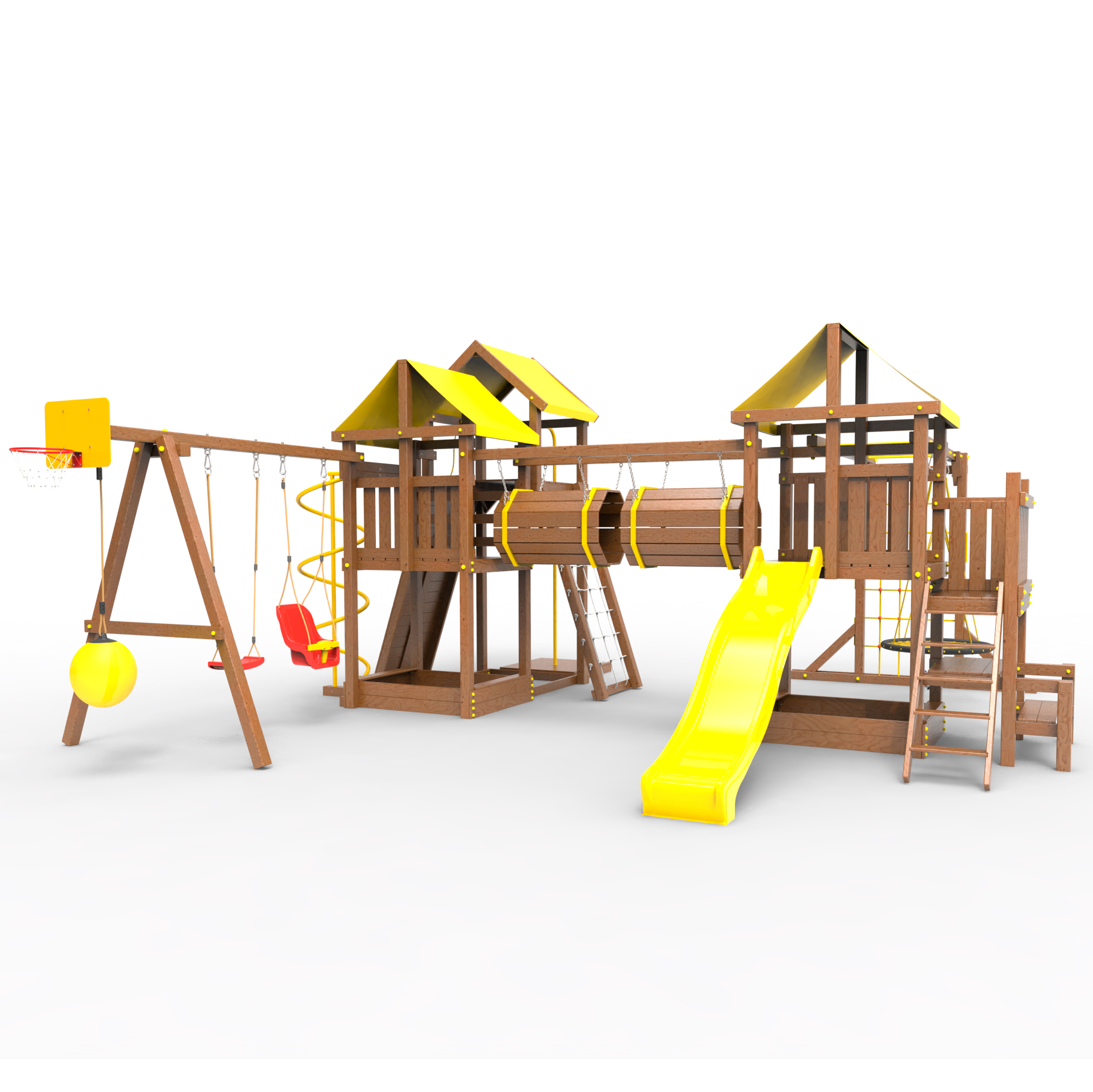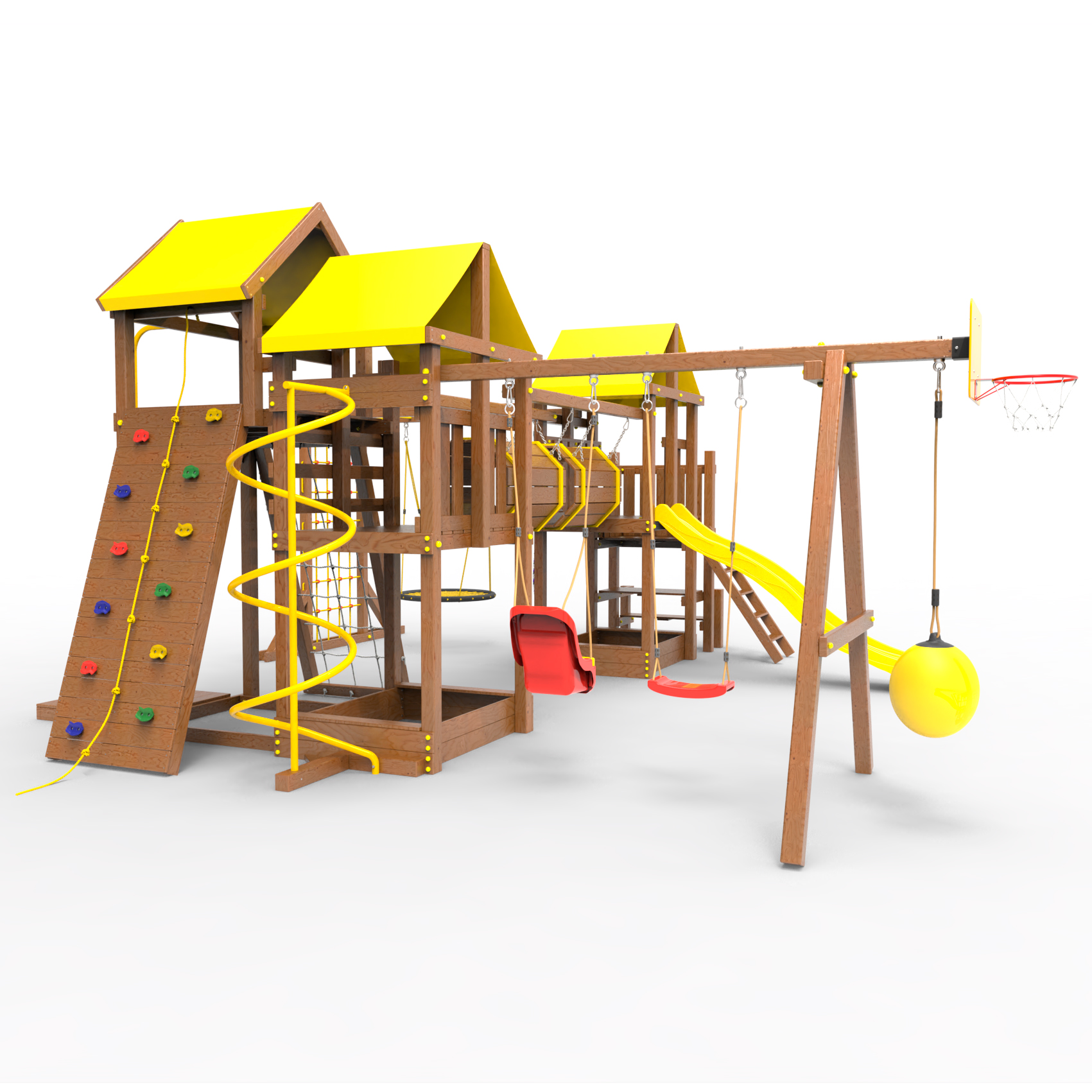 Два домика|Песочница|Лестница|Шторм-трап|Скалодром|Рукоход|Шведская стенка|Турник|Руфер|Баскетбольная корзина|Мостик|Горка|Спираль|Волна|Сеть для лазания|Качели |