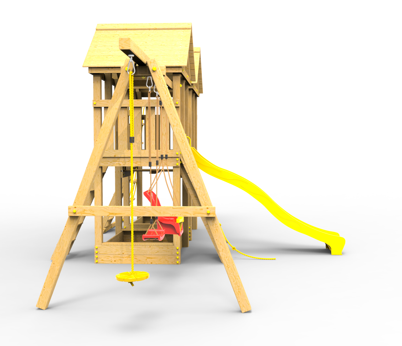 -опоры игрового домика изготовлены из многослойного клееного соснового бруса толщиной 90мм с закругленными углами диаметр 20мм;