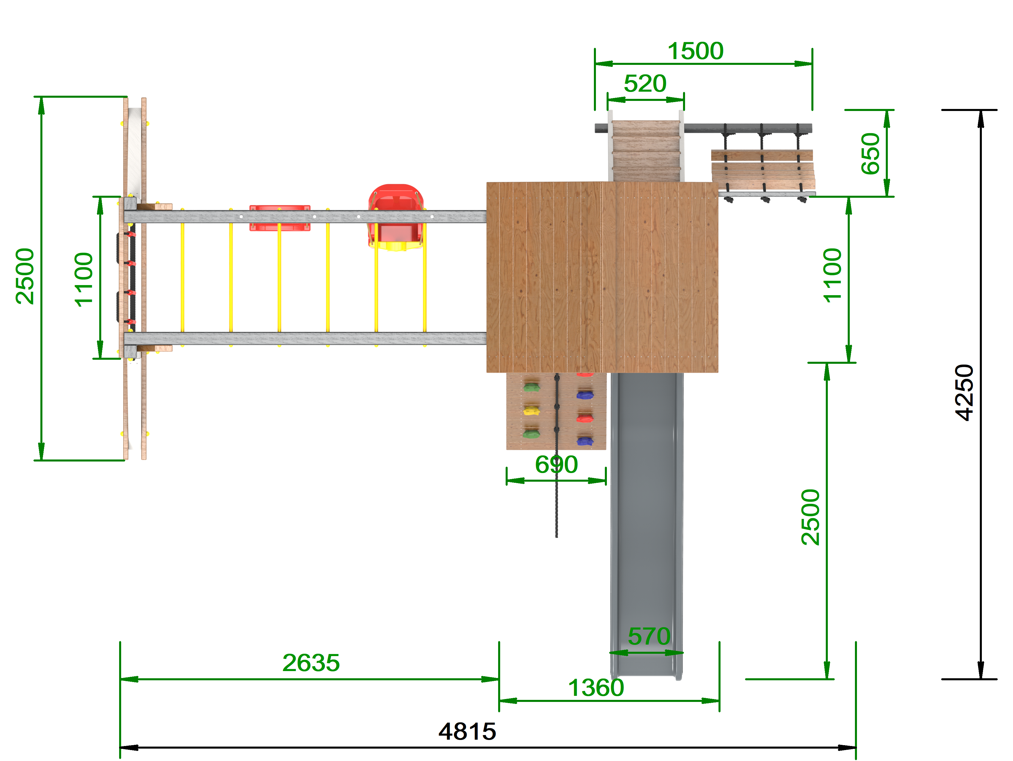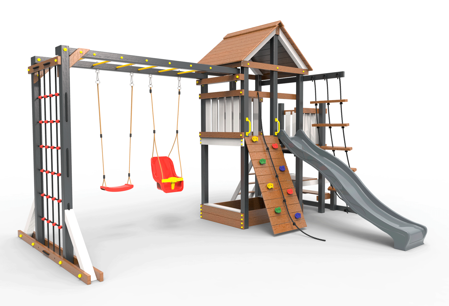 Обращаем Ваше внимание, что фактический цвет детской площадки может отличаться от представленных фото на сайте. Специфика окраски нетоксичными пропитками и красителями допускает отклонения в цветовой гамме отгружаемых изделий. Также обратите внимание, что фактический цвет может отличаться из-за цветопередачи устройства на котором Вы смотрите фото. Производитель оставляет за собой право менять цвет отдельных деталей и комплектующих(включая пластик, канаты и пр.), при этом сохраняя весь функционал и характеристики товара.