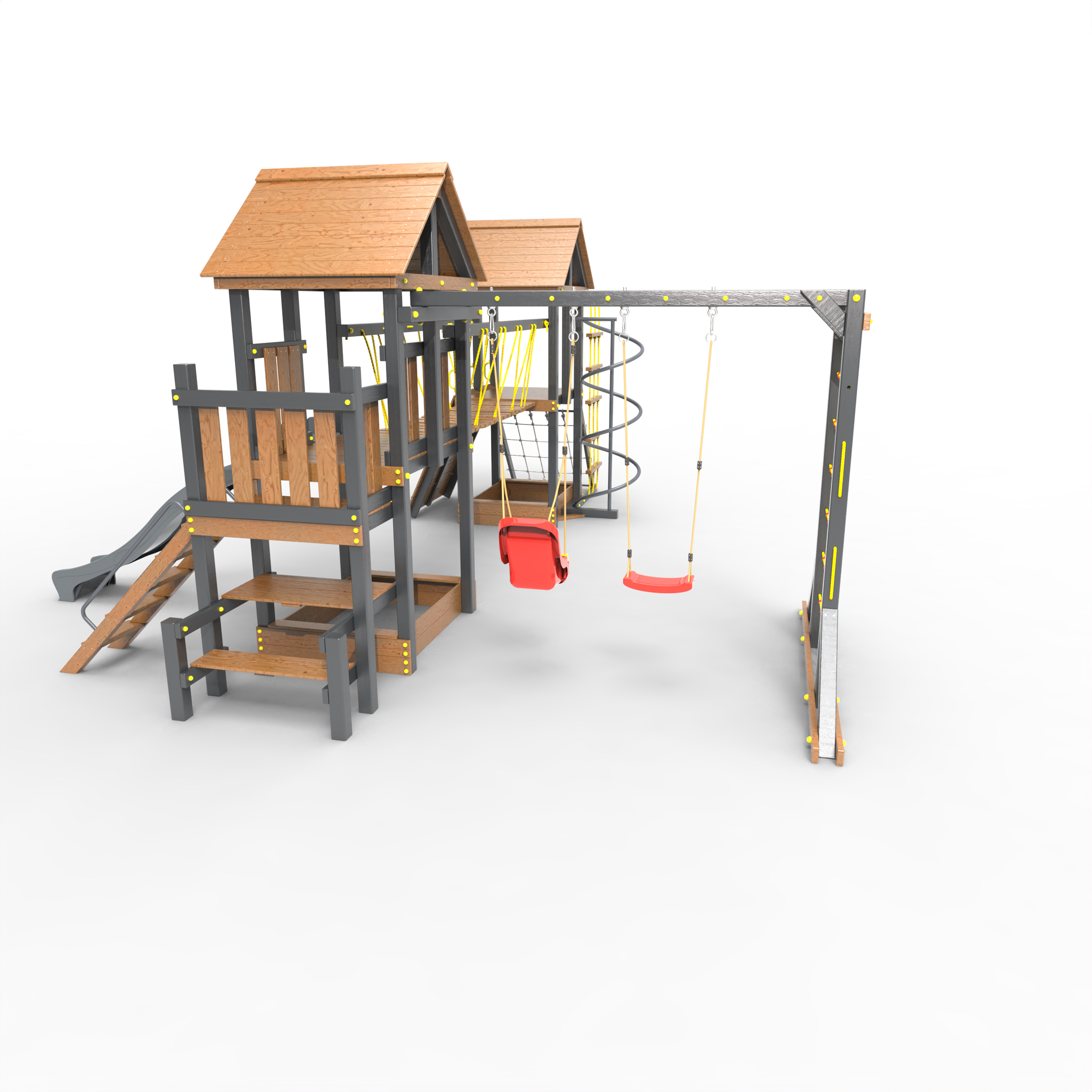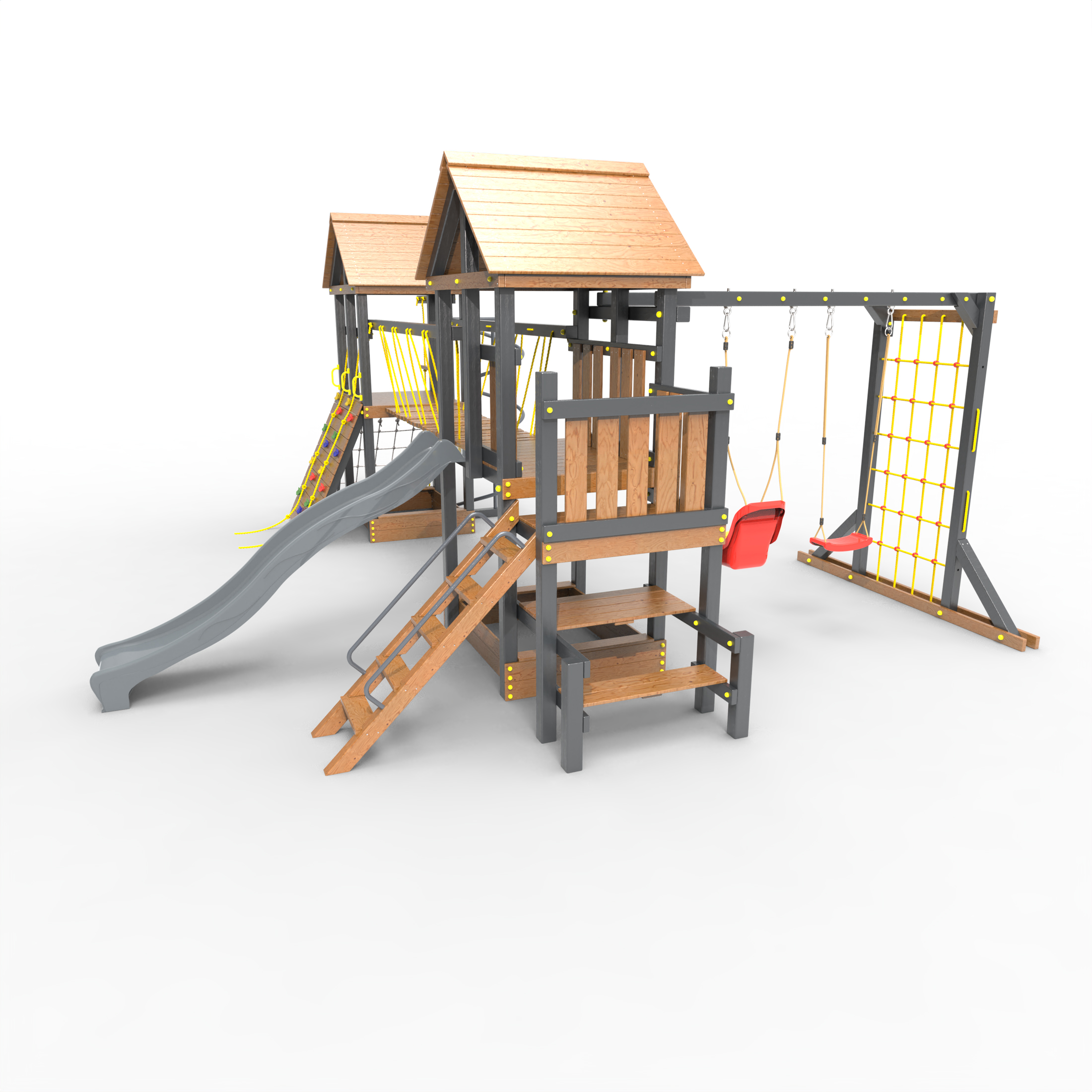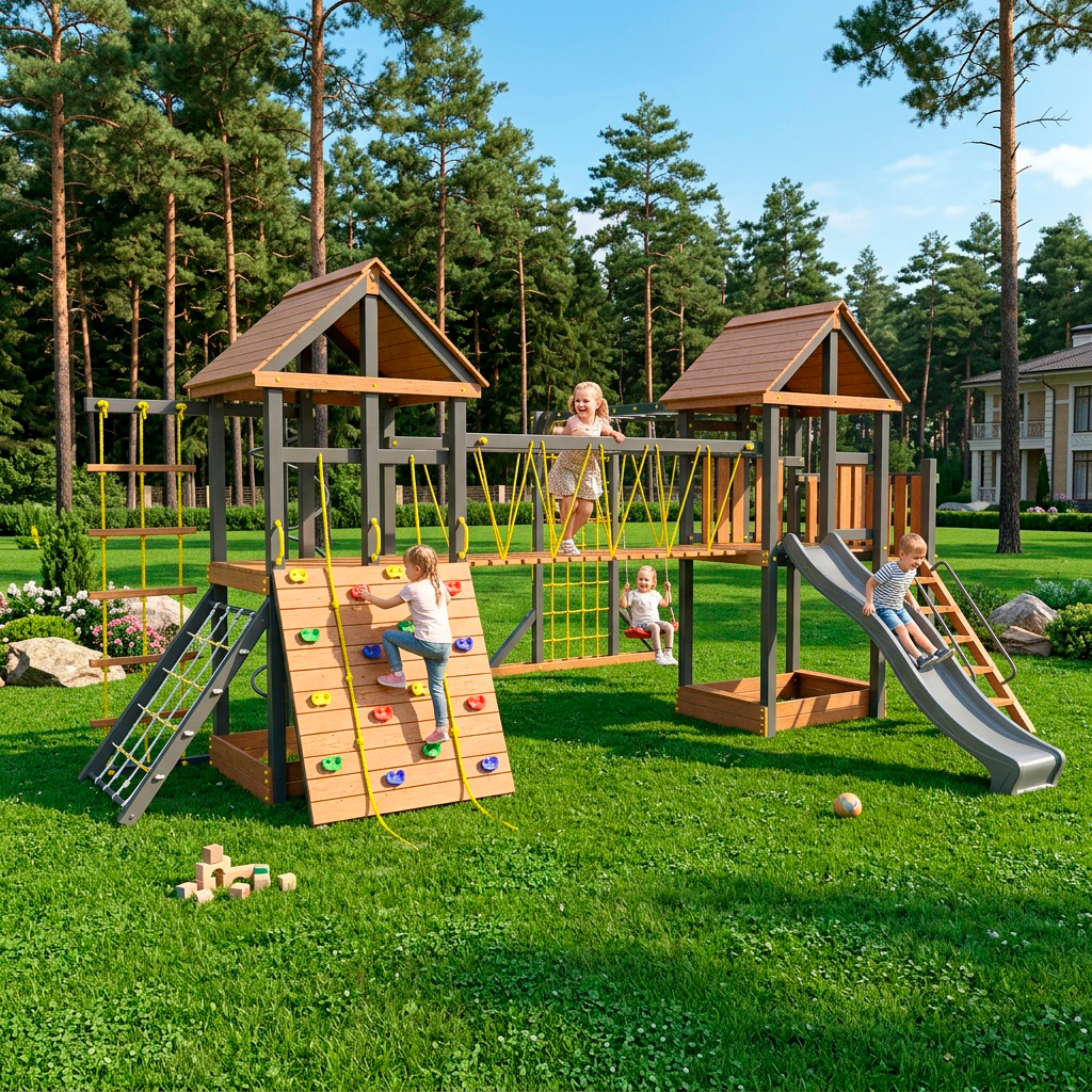 Обращаем Ваше внимание, что фактический цвет детской площадки может отличаться от представленных фото на сайте. Специфика окраски нетоксичными пропитками и красителями допускает отклонения в цветовой гамме отгружаемых изделий. Также обратите внимание, что фактический цвет может отличаться из-за цветопередачи устройства на котором Вы смотрите фото. Производитель оставляет за собой право менять цвет отдельных деталей и комплектующих(включая пластик, канаты и пр.), при этом сохраняя весь функционал и характеристики товара.