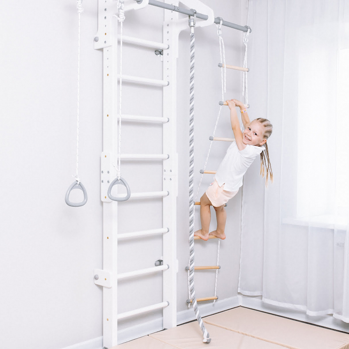 Каркас и ступени спортивного комплекса изготовлены из хвойной древесины, что высоко ценится любителями натуральных материалов в интерьере. Покрытие комплекса выполнено краской белого цвета, экологически безопасной для детей.