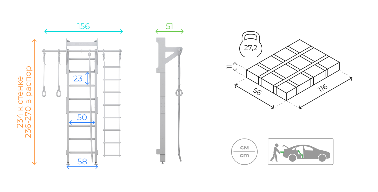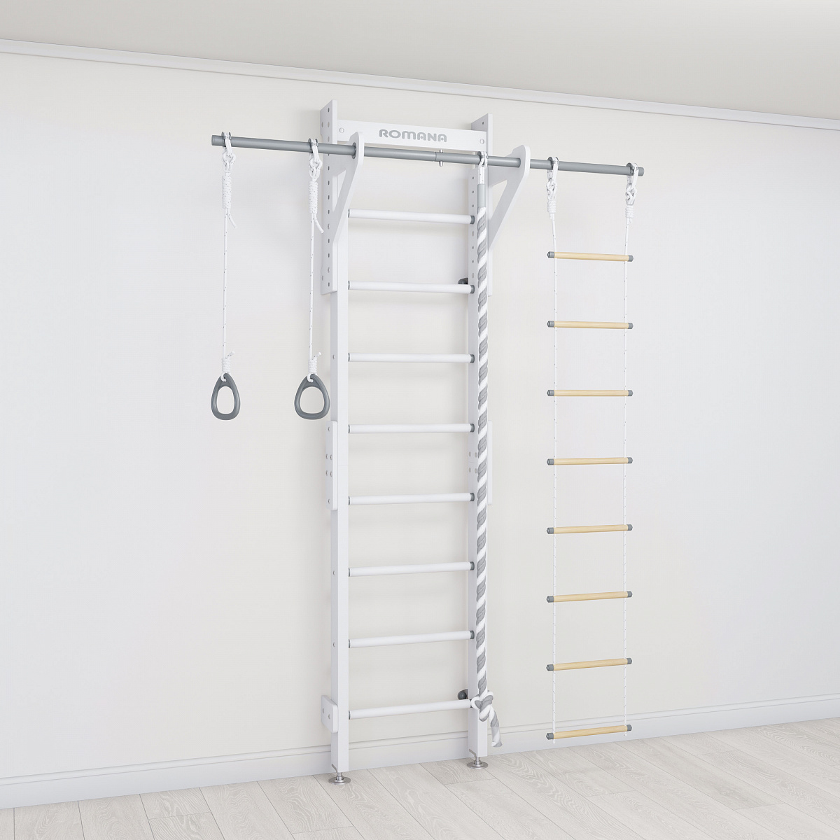 Спортивный комплекс ROMANA Eco2 может быть установлен как к стене, так и враспор - в зависимости от того, как удобно пользователю. По необходимости стенку легко переставить в другое место. В комплексе предусмотрен широкий фиксированный турник, на котором размещается навесное оборудование: кольца, веревочная лестница и канат.